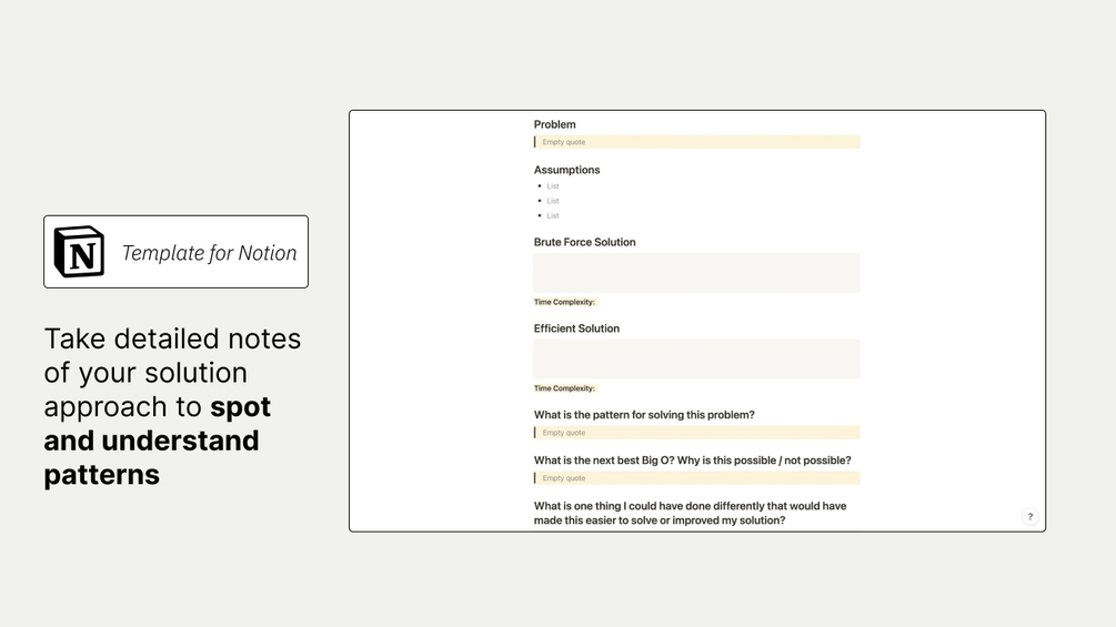 Each problem has a detailed note section where you can keep track of how you approached solving it, the time and space complexity of your solution, and how you can optimise it.